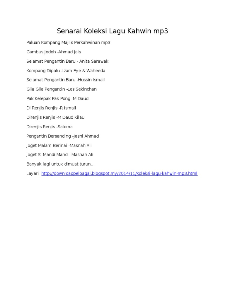 Ada yang dalam list korangAku. Lagu-lagu yang wajib akan dimainkan di majlis perkahwinan anda. Muat Turun Download MP3 Lagu - lagu Pengantin untuk kenduri Perkahwinan.